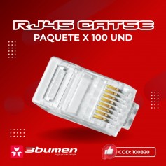El Plug RJ45 Categoría 5E de 3BUMEN es un conector diseñado para garantizar una terminación de red segura, eficiente y de alto rendimiento en instalaciones de cableado estructurado. Fabricado con 8 pines de cobre, contactos en níquel y enchapado en oro, este conector asegura una excelente conductividad eléctrica, reduciendo pérdidas de señal y mejorando la estabilidad en la transmisión de datos. Su diseño estándar 8P8C lo hace compatible con cables UTP Cat 5E y equipos de red convencionales, convirtiéndolo en una solución confiable para técnicos, integradores y proyectos profesionales que requieren calidad constante y facilidad de instalación. La presentación en paquete de 100 unidades permite optimizar costos y asegurar disponibilidad para instalaciones medianas y grandes.